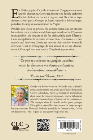 Pendant son séjour en prison, elle communiqua avec ses proches bien-aimés par le truchement de lettres pleines de récits d’épreuves inimaginables, de ténacité et de foi inébranlable dans l’Éternel. Cette compilation de missives extrêmement émouvantes représente le seul lien entre Corrie, ses proches bien-aimés et le monde extérieur. C’est le témoignage de son amour et de son dévouement à Jésus, qui sont une source d’inspiration pour tous.